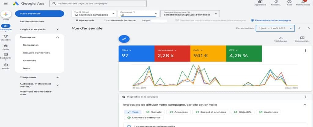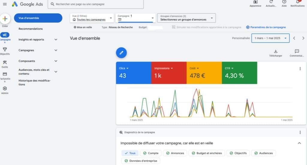 Notre client Serrurier a vu ses coûts de CPC baisser de - 75% (de 5,86 à 1,46 euros). L’augmentation des conversions de + 500% (de 1 à 6 conversions). Notre prestation a fait passer les clics de 23 à 71 soit + 209 %. Et tout cela en moins d’un mois (du 20 juin au 17 juillet) et une campagne un score d’optimisation de 100%.